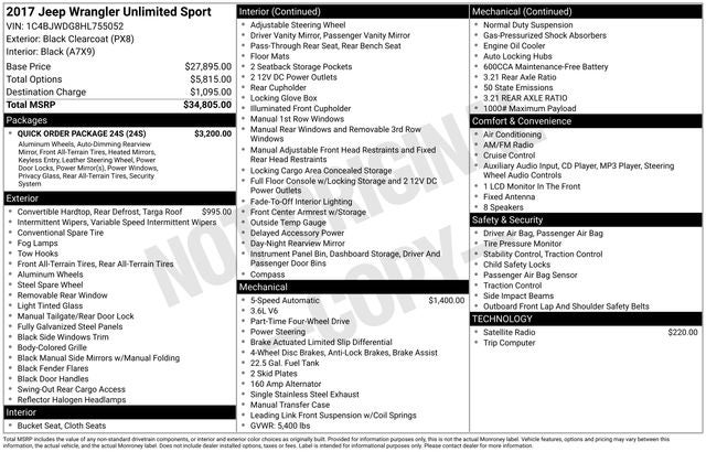 Whether you're an adventurer at heart or simply seeking a versatile and distinctive SUV, this 2017 Jeep Wrangler Unlimited Sport is an exceptional choice. With its impressive performance, exceptional off-road prowess, and well-appointed interior, this Wrangler is ready to take you on the journey of a lifetime.