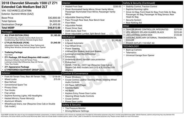 All Star Edition (110-Volt AC Power Outlet, Dual-Zone Automatic Climate Control, Electric Rear-Window Defogger, Remote Vehicle Starter System, and Theft Deterrent System (Unauthorized Entry)), LT Plus Package (Power Adjustable Pedals, Power Sliding Rear Window w/Defogger, and Universal Home Remote), Off-Road Suspension Package (Front Frame-Mounted Black Recovery Hooks, Heavy-Duty Rear Locking Differential, and Hill Descent Control), Preferred Equipment Group 2LT (150 Amp Alternator, 4.2 Diagonal Color Display Driver Info Center, 6 Speaker Audio System, Bluetooth® For Phone, Body Color Bodyside Moldings, Body Color Rear Bumper w/Cornersteps, Body-Color Door Handles, Body-Color Grille Surround, Body-Color Headlamp Bezels, Body-Color Mirror Caps, Body-Color Power Adjustable Heated Outside Mirrors, Chevrolet Connected Access, Chevrolet w/4G LTE, Color-Keyed Carpeting w/Rubberized Vinyl Floor Mats, Deep-Tinted Glass, Driver & Front Passenger Illuminated Vanity Mirrors, EZ Lift & Lower Tailgate, Front Body-Color Bumper, Front Chrome Bumper, HD Radio, Leather Wrapped Steering Wheel w/Cruise Controls, Manual Tilt Wheel Steering Column, OnStar & Chevrolet Connected Services Capable, Power Windows w/Driver Express Up, Rear 60/40 Folding Bench Seat (Folds Up), Rear Chrome Bumper, Rear Wheelhouse Liners, Remote Keyless Entry, Remote Locking Tailgate, Single Slot CD/MP3 Player, Steering Wheel Audio Controls, and Thin Profile LED Fog Lamps), Trailering Package, 6-Speed Automatic Electronic with Overdrive, 4WD, Black Cloth, 10-Way Power Driver's Seat Adjuster, 3.42 Rear Axle Ratio, 4-Wheel Disc Brakes, 40/20/40 Front Split Bench Seat, 6 Speakers, ABS brakes, Air Conditioning, Alloy wheels, AM/FM radio: SiriusXM, Auxiliary External Transmission Oil Cooler, Bodyside moldings, Brake assist, Bumpers: body-color, CD player, Cloth Seat Trim, Compass, Delay-off headlights, Driver door bin, Driver vanity mirror, Dual front impact airbags, Dual front side impact airbags, Electronic Stability Control, Exterior Parking Camera Rear, Front anti-roll bar, Front Center Armrest w/Storage, Front fog l