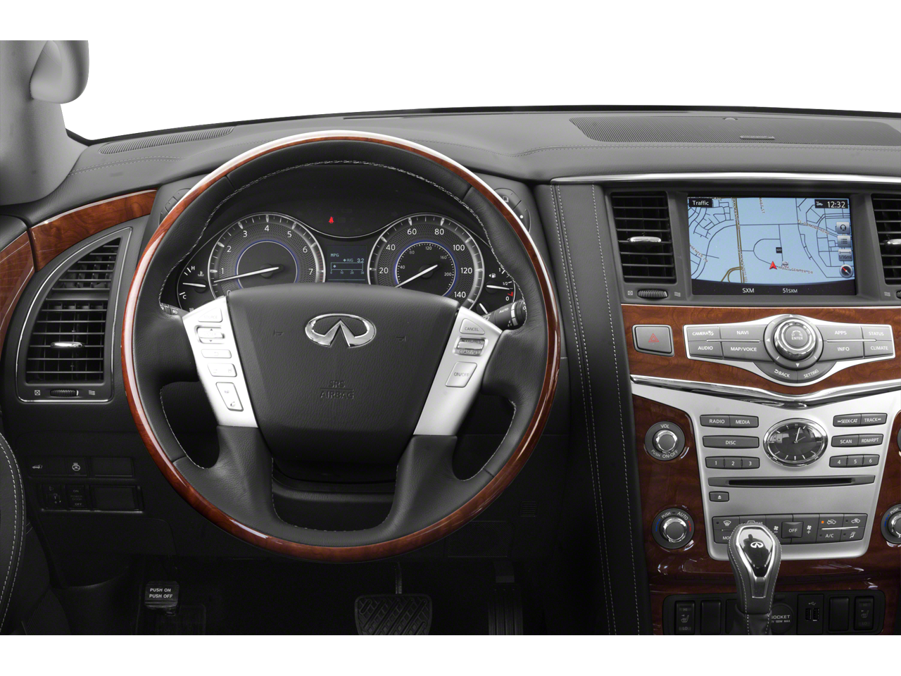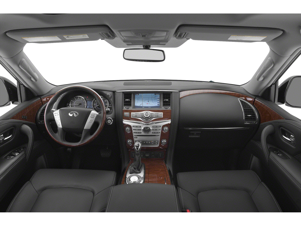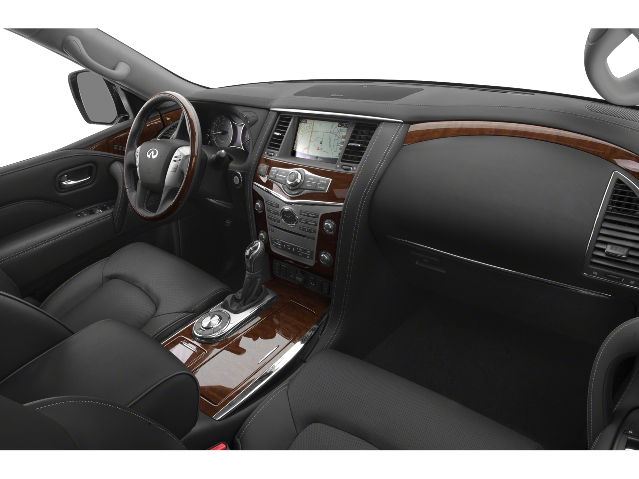 Deluxe Technology Package (Adaptive Front Lighting System, Advanced Climate Control System, Bose Cabin Surround Sound System, Chrome Mirror Caps, Climate-Controlled Front Seats, Espresso/Charcoal Burl Trim, Front Pre-Crash Seatbelts, Headlight Washers, Hydraulic Body Motion Control System, Semi-Aniline Leather-Appointed Seating w/Quilting, and Smart Rear View Mirror (SRVM)), Driver Assistance Package (Backup Collision Intervention (BCI), Blind Spot Intervention (BSI), Blind Spot Warning, Intelligent Cruise Control (Full-Speed Range), and Lane Departure Warning System), Theater Package (120V Power Outlet, Dual 8 Color Monitors, Heated 2nd-Row Seats, and Wireless Headphones (2)), Tire & Wheel Package (Wheels: 22 x 8.0 14-Spoke Forged Aluminum-Alloy), 13 Speakers, 2.94 Axle Ratio, 3rd row seats: split-bench, 4-Wheel Disc Brakes, ABS brakes, Air Conditioning, Alloy wheels, AM/FM radio: SiriusXM, Anti-whiplash front head restraints, Auto High-beam Headlights, Auto tilt-away steering wheel, Auto-dimming door mirrors, Auto-dimming Rear-View mirror, Auto-leveling suspension, Automatic temperature control, Brake assist, Bumpers: body-color, Carpeted Cargo Mat/Cargo Net & First Aid Kit, CD player, Delay-off headlights, Driver door bin, Driver vanity mirror, Dual front impact airbags, Dual front side impact airbags, Electronic Stability Control, Emergency communication system: INFINITI Connection, Four wheel independent suspension, Front anti-roll bar, Front Bucket Seats, Front Center Armrest, Front dual zone A/C, Front fog lights, Front reading lights, Fully automatic headlights, Garage door transmitter: HomeLink, Genuine wood console insert, Genuine wood dashboard insert, Genuine wood door panel insert, Heated door mirrors, Heated Front Bucket Seats, Heated front seats, Heated steering wheel, Illuminated entry, INFINITI Radiant Illuminated Kick Plates, Leather Shift Knob, Leather steering wheel, Leather-Appointed Seats w/Stratford Burl Trim, Low tire pressure warning, Memory seat, Navigation System, Occupant sensing airbag, Outside temperature display, Overhead airbag, Overhead console, Panic alarm, Passenger door bin, Passenger vanity mirror, Power door mirrors, Power driver seat, Power Liftgate, Power moonroof, Power passenger seat, Power steering, Power windows, Radio data system, Radio: AM/FM/HD Single In-Dash CD/DVD Player w/MP3, Rain sensing wipers, Rear air conditioning, Rear anti-roll bar, Rear audio controls, Rear reading lights, Rear seat center armrest, Rear window defroster, Rear window wiper, Reclining 3rd row seat, Remote keyless entry, Roof rack: rails only, Roof Rail Crossbars, Security system, Speed control, Speed-sensing steering, Split folding rear seat, Spoiler, Steering wheel memory, Steering wheel mounted audio controls, Tachometer, Telescoping steering wheel, Tilt steering wheel, Traction control, Trip computer, Turn signal indicator mirrors, Variably intermittent wipers, Voltmeter, and Wheels: 20 x 8.0 Split 6-Spoke Aluminum-Alloy.