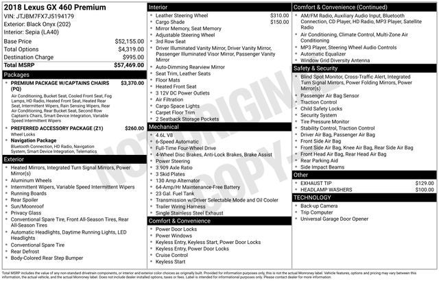 Navigation Package (Lexus Enform Destinations), Preferred Accessory Package (Alloy Wheel Locks, Cargo Net, Carpet Cargo Mat, and Key Gloves), Premium Package (Dual Front & Rear Auto Air Conditioner, Front & Rear Heated Seats, Intuitive Parking Assist, Leather Seat Trim, LED Front Fog & Driving Lamp, Rain Sensing Intermittent Wipers, Ventilated Front Seats, Wheels: 18 x 7.5J Split 6-Spoke Aluminum Alloy, and Windshield De-Icer), Premium Package w/Captains Chairs (2nd Row Captain's Chairs), Power moonroof, 3.909 Axle Ratio, 3rd row seats: split-bench, 4-Wheel Disc Brakes, 9 Speakers, ABS brakes, Air Conditioning, Alloy wheels, AM/FM radio: SiriusXM, Anti-whiplash front head restraints, Auto tilt-away steering wheel, Auto-Dimming & Power-Folding Exterior Mirrors, Auto-dimming Rear-View mirror, Automatic temperature control, Blind Spot Monitor w/Rear Cross Traffic Alert, Bodyside moldings, Brake assist, Bumpers: body-color, Cargo-Area Tonneau Cover, CD player, Compass, Delay-off headlights, Driver door bin, Driver vanity mirror, Driver's Seat Mounted Armrest, Dual front impact airbags, Dual front side impact airbags, Electronic Stability Control, Emergency communication system, Exhaust Tip, Exterior Parking Camera Rear, Front anti-roll bar, Front Bucket Seats, Front dual zone A/C, Front reading lights, Front wheel independent suspension, Fully automatic headlights, Garage door transmitter: HomeLink, Headlamp Washers, Heated door mirrors, Illuminated entry, Illuminated running boards, Knee airbag, Leather Shift Knob, Leather steering wheel, Low tire pressure warning, Mahogany Wood & Leather Trimmed Steering Wheel, Memory seat, Occupant sensing airbag, Outside temperature display, Overhead airbag, Overhead console, Panic alarm, Passenger door bin, Passenger seat mounted armrest, Passenger vanity mirror, Power door mirrors, Power driver seat, Power passenger seat, Power steering, Power windows, Radio data system, Radio: AM/FM Lexus Premium Audio, Rear anti-roll bar, Rear reading lights, Rear seat center armrest, Rear side impact airbag, Rear window defroster, Rear window wiper, Remote keyless entry, Roof rack: rails only, Security system, Speed control, Speed-sensing steering, Split folding rear seat, Spoiler, Steering wheel memory, Steering wheel mounted audio controls, Synthetic Leather NuLuxe Seat Trim, Tachometer, Telescoping steering wheel, Tilt steering wheel, Traction control, Trip computer, Turn signal indicator mirrors, Variably intermittent wipers, and Wheels: 18 x 7.5J 6-Spoke Aluminum Alloy.