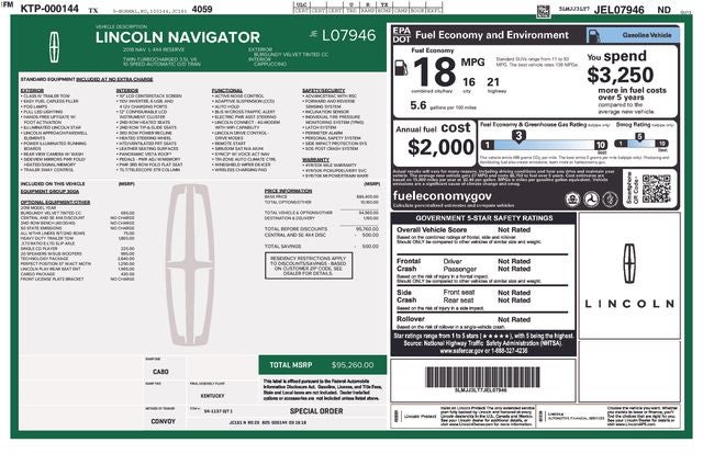 Technology Package (Adaptive Cruise Control, Auto High Beam, Auto Park Active Park Assist, Head-Up Display, Lane Keeping System, and Pre-Collision Assist w/Pedestrian Detection), Cargo Package (Bright Roof Rack w/Crossbars), Equipment Group 300A Reserve, GVWR: 7,800 lbs Payload Package, Heavy-Duty Trailer Tow Package (Electronic Traction Assist (eLSD), Heavy-Duty Radiator, Pro Trailer Backup Assist, and Trailer Brake Controller (TBC)), Auto-leveling suspension, Exterior Parking Camera Rear, Navigation System, Power Liftgate, Power moonroof: Panoramic Vista Roof, 14 Speakers, 1st & 2nd Row All-Weather Floor Liners, 2nd Row Heated 40/20/40 Split Bench Seat, 3.73 Axle Ratio, 30-Way Perfect Position Seating w/Active Motion, 3rd row seats: split-bench, 4-Wheel Disc Brakes, ABS brakes, Adaptive suspension, Adjustable pedals, Air Conditioning, Alloy wheels, AM/FM radio: SiriusXM, AppLink/Apple CarPlay and Android Auto, Audio memory, Auto tilt-away steering wheel, Auto-dimming door mirrors, Auto-dimming Rear-View mirror, Automatic temperature control, Bodyside moldings, Brake assist, Bumpers: body-color, Compass, Delay-off headlights, Driver door bin, Driver vanity mirror, Driver's Seat Mounted Armrest, Dual front impact airbags, Dual front side impact airbags, Electronic Stability Control, Emergency communication system: 911 Assist, Four wheel independent suspension, Front anti-roll bar, Front Bucket Seats, Front dual zone A/C, Front fog lights, Front License Plate Bracket, Front reading lights, Fully automatic headlights, Garage door transmitter: HomeLink, Genuine wood dashboard insert, Genuine wood door panel insert, Heated door mirrors, Heated front seats, Heated rear seats, Heated steering wheel, HVAC memory, Illuminated entry, Leather steering wheel, Lincoln Play, Low tire pressure warning, Memory seat, Occupant sensing airbag, Outside temperature display, Overhead airbag, Overhead console, Panic alarm, Passenger door bin, Passenger seat mounted armrest, Passenger vanity mirror, Pedal memory, Power door mirrors, Power driver seat, Power passenger seat, Power steering, Power windows, Premium Lthr Htd/Ventilated Low-Back Bucket Seats, Radio data system, Radio: Revel AM/FM/HD/MP3 Audio System, Rain sensing wipers, Rear air conditioning, Rear anti-roll bar, Rear audio controls, Rear reading lights, Rear window defroster, Rear window wiper, Reclining 3rd row seat, Remote keyless entry, Revel Ultima Audio System w/20 Speakers, Roof rack: rails only, Security system, Single-CD Player, SiriusXM Radio, Speed control, Speed-sensing steering, Speed-Sensitive Wipers, Split folding rear seat, Spoiler, Steering wheel memory, Steering wheel mounted audio controls, SYNC 3 Communications & Entertainment System, Tachometer, Telescoping steering wheel, Tilt steering wheel, Traction control, Trip computer, Turn signal indicator mirrors, Variably intermittent wipers, Ventilated front seats, and Wheels: 22 16-Spoke Ultra-Bright Machined Alum.