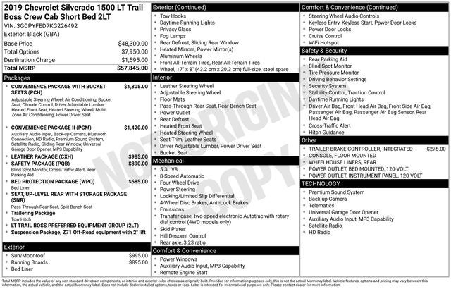Bed Protection Package (Chevytec Spray-On Black Bedliner and Rear Wheelhouse Liners), Convenience Package II (120-Volt Bed Mounted Power Outlet, 120-Volt Instrument Panel Power Outlet, 2 USB Ports, HD Radio, HD Rear Vision Camera, Power Sliding Rear Window w/Rear Defogger, Premium Bose 7-Speaker Sound System, Radio: Chevrolet Infotainment 3 Plus System, SiriusXM Radio, and Universal Home Remote), Convenience Package w/Buckets Seats (10-Way Power Driver Seat w/Lumbar, Dual-Zone Automatic Climate Control, Floor Mounted Console, Front Bucket Seats, Heated Driver & Front Passenger Seats, Heated Steering Wheel, and Manual Tilt/Telescoping Steering Column), Leather Package (Leather Appointed Seat Trim), Preferred Equipment Group 2LT (12-Volt Rear Auxiliary Power Outlet, 170 Amp Alternator, 2 USB Ports (First Row), 4-Way Manual Driver Seat Adjuster, 4.2 Diagonal Color Display Driver Info Center, 6-Speaker Audio System, All-Weather Floor Liner (LPO) (AAK), Auxiliary External Transmission Oil Cooler, Bluetooth® For Phone, Chevrolet Connected Access, Chevrolet w/4G LTE, Color-Keyed Carpeting Floor Covering, Compass, Deep-Tinted Glass, Dual Exhaust w/Polished Outlets, Electric Rear-Window Defogger, Electrical Lock Control Steering Column, Electronic Cruise Control, Front LED Fog Lamps, Heavy-Duty Rear Locking Differential, High Gloss Black Grille, High Gloss Black Mirror Caps, Hitch Guidance, Keyless Open & Start, Leather Wrapped Steering Wheel, LED Cargo Area Lighting, Manual Tilt Wheel Steering Column, OnStar & Chevrolet Connected Services Capable, Performance Red Recovery Hooks, Power Door Locks, Power Front Windows w/Driver Express Up/Down, Power Front Windows w/Passenger Express Down, Power Rear Windows w/Express Down, Rear 60/40 Folding Bench Seat (Folds Up), Rear Dual USB Charging-Only Ports, Rear Vision Camera, Remote Vehicle Starter System, Single-Zone Manual/Semi-Automatic Air Conditioning, Steering Wheel Audio Controls, and Theft Deterrent System (Unauthorized Entry)), Safety Package (Lane Change Alert w/Side Blind Zone Alert, Perimeter Lighting, Rear Cross Traffic Alert, and Ultrasonic Front & Rear Park Assist), Suspension Package (High Capacity Air Filter and Hill Descent Control), Trailering Package, Up-Level Rear Seat w/Storage Package, 8-Speed Automatic, 4WD, Black Leather, 3.23 Rear Axle Ratio, 4-Wheel Disc Brakes, 40/20/40 Front Split-Bench Seat, 6 Speakers, ABS brakes, Air Conditioning, Alloy wheels, AM/FM radio: SiriusXM, Apple CarPlay/Android Auto, Brake assist, Cloth Seat Trim, Delay-off headlights, Driver door bin, Driver vanity mirror, Dual front impact airbags, Dual front side impact airbags, Electronic Stability Control, Front anti-roll bar, Front Center Armrest w/Storage, Front fog lights, Front reading lights, Front wheel independent suspension, Fully automatic headlights, Heated door mirrors, Illuminated entry, Integrated Trailer Brake Controller, Low tire pressure warning, Occupant sensing airbag, Off-Road Assist Steps (LPO), Off-Road Suspension w/2 Lift, Outside temperature display, Overhead airbag, Overhead console, Panic alarm, Passenger door bin, Passenger vanity mirror, Power door mirrors, Power steering, Power Sunroof, Power windows, Premium audio system: Chevrolet Infotainment System 3, Radio data system, Radio: Chevrolet Infotainment 3 System, Rear reading lights, Rear step bumper, Rear window defroster, Remote keyless entry, Security system, Speed control, Speed-sensing steering, Split folding rear seat, Steering wheel mounted audio controls, Tachometer, Tilt steering wheel, Traction control, Trip computer, Variably intermittent wipers, Voltmete