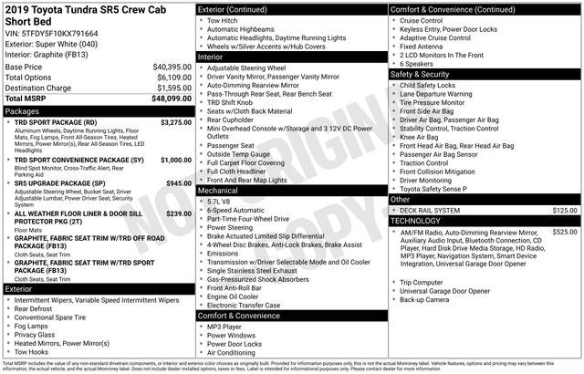 Recent Arrival! CARFAX One-Owner. White 2019 Toyota Tundra SR5 4WD 5.7L 8-Cylinder SMPI DOHC 6-Speed Automatic Electronic