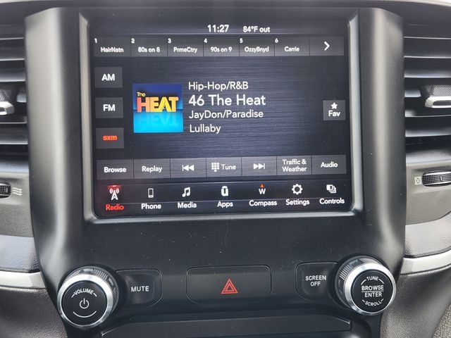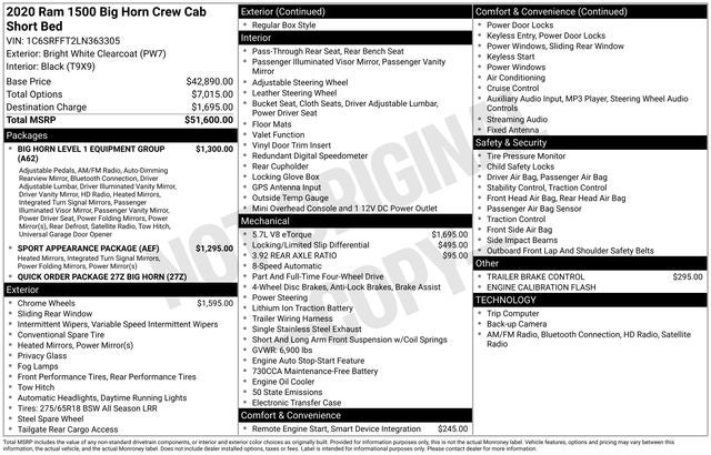 Big Horn Level 1 Equipment Group (2nd Row In Floor Storage Bins, Auto-Dimming Rear-View Mirror, Big Horn IP Badge, Black Premium Power Mirrors, Class IV Receiver Hitch, Cluster 3.5 TFT Color Display, Foam Bottle Insert (Door Trim Panel), Glove Box Lamp, Power 4-Way Driver Lumbar Adjust, Power 8-Way Driver Seat, Power Adjustable Pedals, Radio: Uconnect 4 w/8.4 Display, Rear Dome w/On/Off Switch Lamp, Rear Power Sliding Window, Rear Window Defroster, SiriusXM Satellite Radio, Sun Visors w/Illuminated Vanity Mirrors, and Universal Garage Door Opener), Quick Order Package 23Z Big Horn (Big Horn Badge), Quick Order Package 27Z Big Horn, Sport Appearance Package (3 Rear Seat Head Restraints, 4 Way Front Headrests, Black Interior Accents, Body Color Door Handles, Body Color Front Bumper, Body Color Premium Power Mirrors, Body Color Rear Bumper w/Step Pads, Bucket Seats, Deluxe Cloth Bucket Seats, Front Seat Back Map Pockets, Full Length Floor Console, Grille Surround 1 Body Color Texture 2 Black, Manual Adjust 4-Way Front Passenger Seat, Rear 60/40 Folding Seat, and Sport Decal), ParkView Rear Back-Up Camera, 4-Wheel Disc Brakes, 48V Belt Starter Generator, 6 Speakers, ABS brakes, Air Conditioning, Alloy wheels, AM/FM radio, Anti-Spin Differential Rear Axle, Brake assist, Bumpers: chrome, Cloth Bench Seat, Compass, Delay-off headlights, Driver door bin, Dual front impact airbags, Dual front side impact airbags, Electronic Stability Control, Engine Calibration Flash (DISC), Front anti-roll bar, Front Center Armrest w/Storage, Front fog lights, Front reading lights, Front wheel independent suspension, Fully automatic headlights, GPS Antenna Input, Heated door mirrors, Illuminated entry, Leather steering wheel, Low tire pressure warning, Occupant sensing airbag, Outside temperature display, Overhead airbag, Overhead console, Panic alarm, Passenger door bin, Passenger vanity mirror, Power door mirrors, Power steering, Power windows, Radio data system, Radio: Uconnect 3 w/5 Display, Rear anti-roll bar, Rear seat center armrest, Rear step bumper, Remote keyless entry, Remote Start System, Speed control, Split folding rear seat, Steering wheel mounted audio controls, Tachometer, Telescoping steering wheel, Tilt steering wheel, Traction control, Trailer Brake Control, Trip computer, Variably intermittent wipers, Voltmeter, Wheels: 18 x 8 Cast-Aluminum Painted, and Wheels: 20 x 9 Aluminum Chrome Clad.
