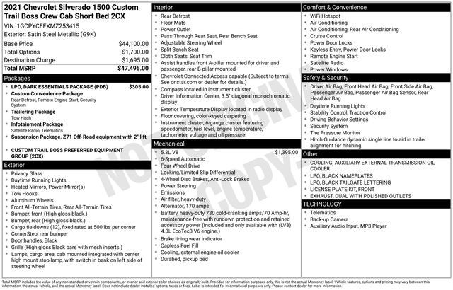 Custom Convenience Package (Electric Rear-Window Defogger, EZ Lift Power Lock & Release Tailgate, LED Cargo Area Lighting, Remote Vehicle Starter System, and Theft Deterrent System (Unauthorized Entry)), Infotainment Package (4G LTE Wi-Fi Hot Spot Capable, Chevrolet Connected Access Capable, OnStar & Chevrolet Connected Services Capable, and SiriusXM Radio), Preferred Equipment Group 2CX (170 Amp Alternator, 3.5 Diagonal Monochromatic Display, Auto-Locking Rear Differential, Bluetooth® For Phone, Color-Keyed Carpeting Floor Covering, Compass, Deep-Tinted Glass, Electronic Cruise Control, Front Rubberized Vinyl Floor Mats, High Gloss Black Grille, Manual Tilt Wheel Steering Column, Performance Red Recovery Hooks, Power Door Locks, Power Front Windows w/Driver Express Up/Down, Power Front Windows w/Passenger Express Down, Power Rear Windows w/Express Down, Rear 60/40 Folding Bench Seat (Folds Up), Rear Rubberized-Vinyl Floor Mats, Remote Keyless Entry, and Standard Tailgate), Suspension Package (Heavy-Duty Air Filter and Hill Descent Control), Trailering Package (Hitch Guidance), Dark Essentials Package (LPO) (Black Name Plates (LPO)), 6-Speed Automatic Electronic with Overdrive, 4WD, Cloth, 3.42 Rear Axle Ratio, 4-Wheel Disc Brakes, 40/20/40 Front Split Bench Seat, 6 Speakers, ABS brakes, Air Conditioning, Alloy wheels, AM/FM radio: SiriusXM, Apple CarPlay/Android Auto, Auxiliary External Transmission Oil Cooler, Black Tailgate CHEVROLET Lettering (LPO), Brake assist, Cloth Seat Trim, Delay-off headlights, Driver door bin, Driver vanity mirror, Dual Exhaust w/Polished Outlets, Dual front impact airbags, Dual front side impact airbags, Electronic Stability Control, Front anti-roll bar, Front Center Armrest w/Storage, Front License Plate Kit, Front reading lights, Front wheel independent suspension, Fully automatic headlights, Heated door mirrors, Illuminated entry, Low tire pressure warning, Occupant sensing airbag, Off-Road Suspension w/2 Lift, Outside temperature display, Overhead airbag, Overhead console, Panic alarm, Passenger door bin, Passenger vanity mirror, Polished Exhaust Tip, Power door mirrors, Power steering, Power windows, Premium audio system: Chevrolet Infotainment 3, Radio data system, Radio: Chevrolet Infotainment 3 System, Rear reading lights, Rear step bumper, Rear window defroster, Remote keyless entry, Security system, Speed control, Speed-sensing steering, Split folding rear seat, Tachometer, Tilt steering whe