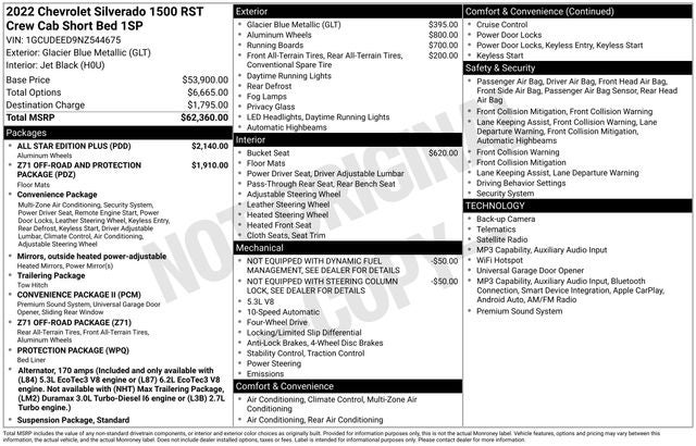 All Star Edition Plus (Wheels: 20 x 9 Painted Aluminum), Convenience Package (10-Way Power Driver Seat w/Lumbar, 120-Volt Bed Mounted Power Outlet, 120-Volt Instrument Panel Power Outlet, Dual Rear USB Ports (Charge Only), Dual-Zone Automatic Climate Control, Electric Rear-Window Defogger, Heated Driver & Front Outboard Passenger Seats, Heated Steering Wheel, Keyless Open & Start, Leather Wrapped Steering Wheel, Manual Tilt/Telescoping Steering Column, Remote Vehicle Starter System, and Theft Deterrent System (Unauthorized Entry)), Convenience Package II (Hitch Guidance w/Hitch View, Integrated Trailer Brake Controller, Power Sliding Rear Window w/Rear Defogger, Premium Bose 7-Speaker Sound System, Trailering App, and Universal Home Remote), High Capacity Suspension Package, Preferred Equipment Group 1SP (12.3 Multicolor Reconfigurable Digital Display, 6-Speaker Audio System, All-Star Edition, Auto-Locking Rear Differential, Bluetooth® For Phone, Chevrolet Connected Access Capable, Color-Keyed Carpeting Floor Covering, Compass, Deep-Tinted Glass, Electrical Steering Column Lock, Electronic Cruise Control, EZ Lift Power Lock & Release Tailgate, Front Frame-Mounted Black Recovery Hooks, Front LED Fog Lamps, Front Rubberized Vinyl Floor Mats, HD Rear Vision Camera, Heated Power-Adjustable Outside Mirrors, High Gloss Black Mirror Caps, Inside Rear-View Mirror w/Tilt, LED Cargo Area Lighting, OnStar & Chevrolet Connected Services Capable, Power Front Windows w/Driver Express Up/Down, Power Front Windows w/Passenger Express Down, Power Rear Windows w/Express Down, Rear 60/40 Folding Bench Seat (Folds Up), Rear Rubberized-Vinyl Floor Mats, SiriusXM w/360L, Standard Tailgate, Steering Wheel Audio Controls, Wi-Fi Hot Spot Capable, and Wireless Phone Projection), Protection Package (Chevytec Spray-On Black Bedliner and Rear Wheelhouse Liners), Standard Suspension Package, Trailering Package (Hitch Guidance), Z71 Off-Road & Protection Package (All-Weather Floor Liner (LPO) (AAK)), Z71 Off-Road Package (Dual Exhaust w/Polished Outlets, Heavy-Duty Air Filter, Hill Descent Control, and Off-Road Suspension), 10-Speed Automatic, 4WD, Black Cloth, 2 USB Data Ports, 220 Amp Alternator, 3.23 Rear Axle Ratio, 4-Wheel Disc Brakes, 40/20/40 Front Split-Bench Seat, 6 Speakers, ABS brakes, Air Conditioning, Alloy wheels, AM/FM radio: SiriusXM with 360L, Apple CarPlay/Android Auto, Auto High-beam Headlights, Automatic Emergency Braking, Automatic temperature control, Brake assist, Bumpers: body-color, Chrome Assist Steps, Cloth Seat Trim, Delay-off headlights, Driver door bin, Driver vanity mirror, Dual front impact airbags, Dual front side impact airbags, Electronic Stability Control, Electronic Transmission Range Selector Shifter, Floor Mounted Center Console, Following Distance Indicator, Forward Collision Alert, Front anti-roll bar, Front Bucket Seats, Front Center Armrest w/Storage, Front dual zone A/C, Front fog lights, Front Pedestrian Braking, Front reading lights, Front wheel independent suspension, Fully automatic headlights, Heated door mirrors, Heated front seats, Heated steering wheel, Illuminated entry, IntelliBeam Automatic High Beam On/Off, Lane Keep Assist w/Lane Departure Warning, Low tire pressure warning, Not Equipped w/Dynamic Fuel Management, Not Equipped w/Steering Column Lock, Occupant sensing airbag, Outside temperature display, Overhead airbag, Overhead console, Panic alarm, Passenger door bin, Passenger vanity mirror, Power door mirrors, Power driver seat, Power steering, Power windows, Premium audio system: Chevrolet Infotainment 3 Premium, Radio data system, Radio: Chevrolet Infotainment 3 Premium System, R
