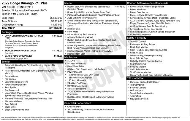 Cargo Plus Group (Black Roof Rails, Cargo Compartment Cover, and Integrated Roof Rail Crossbars), Quick Order Package 22C R/T Plus (#5 Seat Foam Cushion, 19 harman/kardon Amplified Speakers w/Subwoofer, 825 Watt Amplifier, Adaptive Cruise Control w/Stop, Advanced Brake Assist, Floor Console w/Leather Armrest, Full Speed Forward Collision Warning Plus, Lane Departure Warning Plus, Leather Trimmed Bucket Seats, Leather Wrapped Door Panels, Power Sunroof, Premium Instrument Panel, Suede Headliner, and Ventilated Front Seats), Trailer Tow Group IV (7 & 4 Pin Wiring Harness, Class IV Receiver Hitch, Heavy-Duty Engine Cooling, Rear Load Leveling Suspension, and Trailer Brake Control), 2nd Row Fold/Tumble Captain Chairs, 2nd Row Mini Console w/Cupholders, 2nd Row Seat Mounted Inboard Armrests, 3.09 Rear Axle Ratio, 3rd row seats: split-bench, 4-Wheel Disc Brakes, 6-Passenger Seating, 9 Speakers, ABS brakes, Air Conditioning, Alloy wheels, AM/FM radio: SiriusXM w/360L, Anti-whiplash front head restraints, Apple CarPlay/Android Auto, Audio memory, Auto High-beam Headlights, Auto-dimming door mirrors, Auto-dimming Rear-View mirror, Auto-leveling suspension, Automatic temperature control, Brake assist, Bumpers: body-color, Compass, Delay-off headlights, Driver door bin, Driver vanity mirror, Dual front impact airbags, Dual front side impact airbags, Electronic Stability Control, Emergency communication system: SiriusXM Guardian, Four wheel independent suspension, Front anti-roll bar, Front Bucket Seats, Front Center Armrest w/Storage, Front dual zone A/C, Front fog lights, Front reading lights, Fully automatic headlights, Garage door transmitter, Heated door mirrors, Heated front seats, Heated rear seats, Heated steering wheel, Illuminated entry, Knee airbag, Leather steering wheel, Leather Suede Bucket Seats, Low tire pressure warning, Memory seat, Mini Console 3rd Row Floor Mat, Navigation system: TomTom, Occupant sensing airbag, Outside temperature display, Overhead airbag, Overhead console, Panic alarm, ParkView Rear Back-Up Camera, Passenger door bin, Passenger vanity mirror, Power door mirrors, Power driver seat, Power Liftgate, Power passenger seat, Power steering, Power windows, Radio data system, Radio: Uconnect 5 Nav w/10.1 Display, Rain sensing wipers, Rear air conditioning, Rear anti-roll bar, Rear reading lights, Rear seat center armrest, Rear window defroster, Rear window wiper, Remote keyless entry, Security system, Speed control, Speed-sensing steering, Speed-Sensitive Wipers, Split folding rear seat, Spoiler, Steering wheel mounted audio controls, Tachometer, Telescoping steering wheel, Tilt steering wheel, Traction control, Trip computer, Turn signal indicator mirrors, Variably intermittent wipers, Voltmeter, and Wheels: 20 x 8.0 Fine Silver.