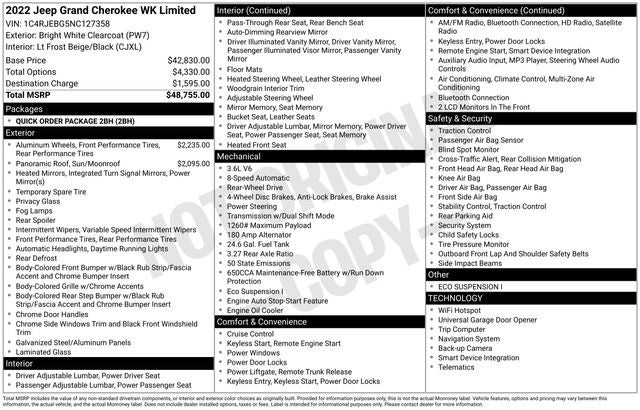 Quick Order Package 2BH, 3.27 Rear Axle Ratio, 4-Wheel Disc Brakes, 6 Speakers, ABS brakes, Air Conditioning, Alloy wheels, AM/FM radio: SiriusXM, Anti-whiplash front head restraints, Apple CarPlay/Android Auto, Audio memory, Auto-dimming door mirrors, Auto-dimming Rear-View mirror, Automatic temperature control, Brake assist, Bumpers: body-color, Compass, Delay-off headlights, Driver door bin, Driver vanity mirror, Dual front impact airbags, Dual front side impact airbags, Eco Suspension I, Electronic Stability Control, Emergency communication system: SiriusXM Guardian, Four wheel independent suspension, Front anti-roll bar, Front Bucket Seats, Front Center Armrest w/Storage, Front dual zone A/C, Front fog lights, Front reading lights, Fully automatic headlights, Garage door transmitter, Heated door mirrors, Heated front seats, Heated steering wheel, Illuminated entry, Knee airbag, Leather Shift Knob, Leather Trimmed Bucket Seats, Low tire pressure warning, Memory seat, Navigation System, Occupant sensing airbag, Outside temperature display, Overhead airbag, Overhead console, Panic alarm, ParkView Rear Back-Up Camera, Passenger door bin, Passenger vanity mirror, Power door mirrors, Power driver seat, Power Liftgate, Power moonroof, Power passenger seat, Power steering, Power windows, Radio data system, Radio: Uconnect 4C Nav w/8.4 Display, Rear anti-roll bar, Rear reading lights, Rear seat center armrest, Rear window defroster, Rear window wiper, Remote keyless entry, Security system, Speed control, Speed-sensing steering, Speed-Sensitive Wipers, Split folding rear seat, Spoiler, Steering wheel mounted audio controls, Tachometer, Telescoping steering wheel, Tilt steering wheel, Traction control, Trip computer, Turn signal indicator mirrors, Variably intermittent wipers, Wheels: 18 x 8.0 Tech Gray Diamond Cut, and Wheels: 20 x 8.0 Polished/Tech Gray Aluminum.