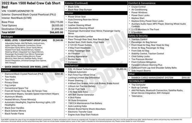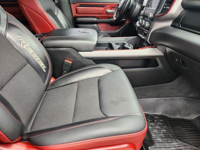 Quick Order Package 28W Rebel, Rebel Level 1 Equipment Group (2nd Row In Floor Storage Bins, 4G LTE Wi-Fi Hot Spot, 8.4 Touchscreen Display, Apple CarPlay, Auto-Dimming Exterior Driver Mirror, Black Exterior Mirrors, Black Premium Power Mirrors, Bluetooth® Handsfree Phone & Audio, Connectivity - US/Canada, Convex Wide-Angle Mirror Insert, Exterior Mirrors Courtesy Lamps, Exterior Mirrors w/Heating Element, Exterior Mirrors w/Supplemental Signals, Foam Bottle Insert (Door Trim Panel), For Details, Visit DriveUconnect.com, Global Telematics Box Module (TBM), Google Android Auto, GPS Antenna Input, Heated Front Seats, Heated Steering Wheel, Integrated Center Stack Radio, Power Adjustable Pedals, Power-Folding Mirrors, Radio: Uconnect 5 W w/8.4 Display, Rear Dome w/On/Off Switch Lamp, Rear Window Defroster, SiriusXM Radio Service, SiriusXM Satellite Radio, Sun Visors w/Illuminated Vanity Mirrors, Universal Garage Door Opener, and USB Host Flip), 3.92 Rear Axle Ratio, 4 Way Front Headrests, 4-Wheel Disc Brakes, 48V Belt Starter Generator, 6 Speakers, ABS brakes, Air Conditioning, Alloy wheels, AM/FM radio: SiriusXM, Auto-dimming Rear-View mirror, Brake assist, Bucket Seats, Cloth/Vinyl Low Back Bucket Seats, Compass, Delay-off headlights, Driver door bin, Dual front impact airbags, Dual front side impact airbags, Electronic Stability Control, Emergency communication system: SiriusXM Guardian, Exterior 115V AC Outlet, Front anti-roll bar, Front Bucket Seats, Front Center Armrest w/Storage, Front fog lights, Front reading lights, Front Seat Back Map Pockets, Front wheel independent suspension, Full Length Upgraded Floor Console, Fully automatic headlights, Heated door mirrors, Illuminated entry, Integrated Voice Command w/Bluetooth®, Leather steering wheel, Low tire pressure warning, Occupant sensing airbag, Outside temperature display, Overhead airbag, Overhead console, Panic alarm, ParkView Rear Back-Up Camera, Passenger door bin, Passenger vanity mirror, Power 2-Way Driver Lumbar Adjust, Power door mirrors, Power driver seat, Power steering, Power windows, Radio data system, Radio: Uconnect 3 w/5 Display, RamBox Cargo Management System, Rear 60/40 Folding Seat, Rear anti-roll bar, Rear seat center armrest, Rear step bumper, Remote keyless entry, Speed control, Split folding rear seat, Steering wheel mounted audio controls, Tachometer, Telescoping steering wheel, Tilt steering wheel, Traction control, Trip computer, Twill Film Appliques, Variably intermittent wipers, Voltmeter, and Wheels: 18 x 8.0 Painted Mid-Gloss BlacK.