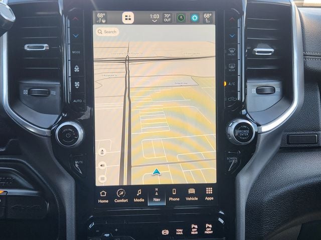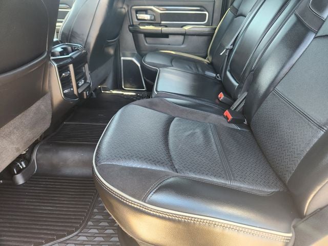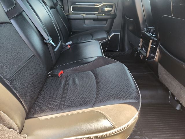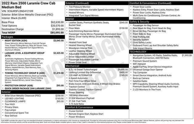 Laramie Level An Equipment Group (2nd Row In Floor Storage Bins, Auto High Beam Headlamp Control, Chrome Exterior Mirrors, Exterior Mirrors Courtesy Lamps, Exterior Mirrors w/Heating Element, Exterior Mirrors w/Memory, Exterior Mirrors w/Supplemental Signals, Foam Bottle Insert (Door Trim Panel), Mirror Running Lights, Mirror-Mounted Aux Reverse Lamps, Power Adjustable Convex Aux Mirrors, Power Adjustable Pedals w/Memory, Power Chrome Tow Mirrors w/Convex Spotter & Memory, Power Folding Mirrors, Radio/Driver Seat/Mirrors/Pedals Memory, Rain Sensitive Windshield Wipers, Remote Tailgate Release, and Trailer Tow Mirrors), Night Edition (Black Exterior Mirrors, Black Exterior Truck Badging, Black Headlamp Bezels, Black Interior Accents, Black Ram Head Tailgate Badge, Black Tail Lamp Bezels, Black Wheel Center Hub, Body Color Door Handles, Body Color Grille Surround, Gloss Black Grille Billets/Accents, Painted Front Bumper, Painted Rear Bumper, Power Black Tow Mirrors w/Convex Spotter & Memory, and Wheels: 20 x 8.0 Black Painted Aluminum), Protection Group, Quick Order Package 2HH Laramie, Towing Technology Group B (CTR Stop Lamp w/Cargo View Camera, Surround View Camera System, and Trailer Reverse Guidance), GPS Navigation, 10 Speakers, 115V Auxiliary Rear Power Outlet, 12 Touchscreen Display, 2 Way Rear Headrest Seat, 220 Amp Alternator, 3.73 Axle Ratio, 4 Way Front Headrests, 4-Wheel Disc Brakes, 4G LTE Wi-Fi Hot Spot, 8.4 Touchscreen Display, ABS brakes, Active Noise Control System, Adjustable pedals, Air Conditioning, Alexa Built-In, All R1 High Radios, All Radio Equipped Vehicles, Alloy wheels, AM/FM radio: SiriusXM, Anti-Spin Differential Rear Axle, Apple CarPlay, Apple CarPlay/Android Auto, Auto-dimming Rear-View mirror, Automatic temperature control, Bluetooth® Handsfree Phone & Audio, Brake assist, Bumpers: chrome, Clearance Lamps, Compass, Connected Travel & Traffic Services, Connectivity - US/Canada, Delay-off headlights, Disassociated Touchscreen Display, Driver door bin, Driver vanity mirror, Dual front impact airbags, Dual front side impact airbags, Electronic Stability Control, Electronically Controlled Throttle, For Details, Visit DriveUconnect.com, For More Info, Call 800-643-2112, Front anti-roll bar, Front Center Armrest w/Storage, Front dual zone A/C, Front fog lights, Front reading lights,
