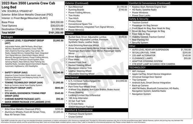 Bed Utility Group (LED Bed Lighting, MOPAR Deployable Bed Step, and MOPAR Spray In Bedliner), Chrome Bumper Package (Bright Front Bumper and Bright Rear Bumper), Laramie Level F Equipment Group (12 Touchscreen Display, 17 Speaker harman kardon Premium Sound, 2nd Row In Floor Storage Bins, 4G LTE Wi-Fi Hot Spot, Alexa Built-In, Apple CarPlay, Auto Adjust In Reverse Exterior Mirrors, Auto Dim Exterior Mirror, Auto Dimming Exterior Passenger Mirror, Auto High Beam Headlamp Control, Auto Power-Folding Mirrors, Blind Spot & Cross Path Detection, Chrome Exterior Mirrors, Connected Travel & Traffic Services, Connectivity - US/Canada, Disassociated Touchscreen Display, Exterior Mirrors Courtesy Lamps, Exterior Mirrors w/Heating Element, Exterior Mirrors w/Memory, Exterior Mirrors w/Supplemental Signals, Foam Bottle Insert (Door Trim Panel), For Details Visit DriveUconnect.com, For More Info, Call 800-643-2112, Forward & Reverse Utility Lights, Front LED Fog Lamps, Global Telematics Box Module (TBM), Google Android Auto, GPS Antenna Input, GPS Navigation, HD Radio, Heated Second Row Seats, Integrated Voice Command w/Bluetooth®, LED Reflector Headlamps, Mirror Running Lights, Off-Road Information Pages, ParkSense Front/Rear Park Assist System, Power Adjust Mirrors, Power Adjustable Pedals w/Memory, Power Heat Fold Memory Telescopic Mirrors, Power Telescoping Mirrors, Power-Adjustable Convex Aux Mirrors, Radio: Uconnect 5 Nav w/12.0 Display, Rain Sensitive Windshield Wipers, Rear Power Sliding Window, Rear Window Defroster, Remote Tailgate Release, Selectable Tire Fill Alert, SiriusXM Radio Service, SiriusXM w/360L, and Trailer Tow Pages), Quick Order Package 2