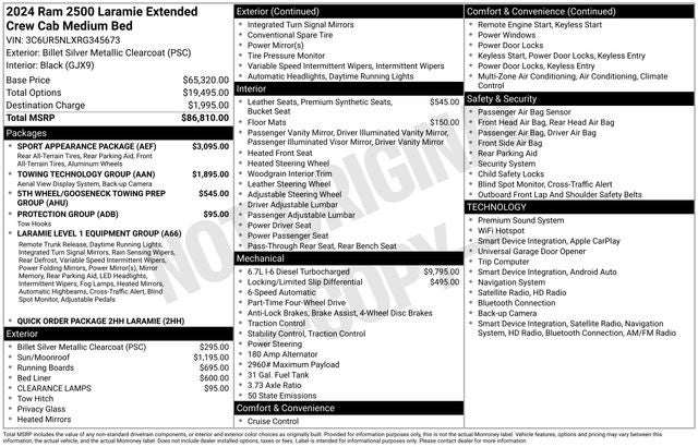 Laramie Level 1 Equipment Group (12 Touchscreen Display, 4G LTE Wi-Fi Hot Spot, Alexa Built-In, Apple CarPlay, Auto Adjust In Reverse Exterior Mirrors, Auto Dim Exterior Mirror, Auto High Beam Headlamp Control, Auto Power-Folding Mirrors, Auto-Dimming Exterior Passenger Mirror, Blind Spot & Cross Path Detection, Connected Travel & Traffic Services, Connectivity - US/Canada, Disassociated Touchscreen Display, Exterior Mirrors Courtesy Lamps, Exterior Mirrors w/Heating Element, Exterior Mirrors w/Memory, Exterior Mirrors w/Supplemental Signals, Forward & Reverse Utility Lights, Front LED Fog Lamps, Google Android Auto, GPS Antenna Input, GPS Navigation, HD Radio, Integrated Voice Command w/Bluetooth®, LED Reflector Headlamps, LED Tail Lamps, Mirror Power Heat Fold Memory Tele, Mirror Running Lights, Power Adjust Mirrors, Power Adjustable Convex Aux Mirrors, Power Adjustable Pedals w/Memory, Power Telescoping Mirrors, Radio: Uconnect 5 Nav w/12.0 Display, Rain Sensitive Windshield Wipers, Rear Power Sliding Window, Remote Tailgate Release, SiriusXM w/360L, Trailer Tow Pag