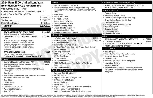 Longhorn Level 1 Equipment Group (12 Touchscreen Display, 17 Speaker harman/kardon Premium Sound, 4G LTE Wi-Fi Hot Spot, Alexa Built-In, Apple CarPlay, Blind Spot & Cross Path Detection, Connected Travel & Traffic Services, Connectivity - US/Canada, Disassociated Touchscreen Display, For Details, Visit DriveUconnect.com, For More Info, Call 800-643-2112, Global Telematics Box Module (TBM), Google Android Auto, GPS Antenna Input, GPS Navigation, HD Radio, Integrated Voice Command w/Bluetooth®, LED Bed Lighting, MOPAR Spray In Bedliner, Off-Road Information Pages, Power Deployable Running Boards, Radio: Uconnect 5 Nav w/12.0 Display, Ramcharger Wireless Charging Pad, Selectable Tire Fill Alert, SiriusXM Radio Service, SiriusXM w/360L, and Trailer Tow Pages), Off Road Package (Front Performance Tuned Shock Absorbers, Hill Descent Control, and Rear Performance Tuned Shock Absorbers), Quick Order Package 2HK Longhorn, Towing Technology Group (Center Stop Lamp w/Cargo View Camera, Surround View Camera System, and Trailer Reverse Guidance), 10 Speakers, 115V Auxiliary Rear Power Outlet, 2 Way Rear Headrest Seat, 3.73 Axle Ratio, 4 Adjustable Cargo Tie-Down Hooks, 4 Way Front Headrests, 4-Wheel Disc Brakes, ABS brakes, Active Noise Control System, Adjustable pedals, Air Conditioning, Alloy wheels, AM/FM radio: SiriusXM with 360L, Anti-Spin Differential Rear Axle, Apple CarPlay/Android Auto, Audio memory, Auto High-beam Headlights, Auto-dimming door mirrors, Auto-dimming Rear-View mirror, Automatic temperature control, Brake assist, Bucket Seats, Bumpers: body-color, Center Hub, Clearance Lamps, Compass, Delay-off headlights, Driver door bin, Driver vanity mirror, Dual front impact airbags, Dual front side impact airbags, Electronic Stability Control, Electronically Controlled Throttle, Front anti-roll bar, Front Bucket Seats, Front Center Armrest w/Storage, Front dual zone A/C, Front fog lights, Front License Plate Bracket, Front reading lights, Front Seat Back Map Pockets, Full Length Premium Upgraded Floor Console, Fully automatic headlights, Garage door transmitter, Genuine wood console insert, Genuine wood dashboard insert, Genuine wood door panel insert, Heated door mirrors, Heated Front Seats, Heated front seats, Heated rear seats, Heated Second Row Seats, Heated Steering Wheel, Heated steering wheel, High Back Seats, Illuminated entry, Leather steering wheel, Low tire pressure warning, Memory seat, Navigation System, Occupant sensing airbag, Outside temperature display, Overhead airbag, Overhead console, Panic alarm, ParkView