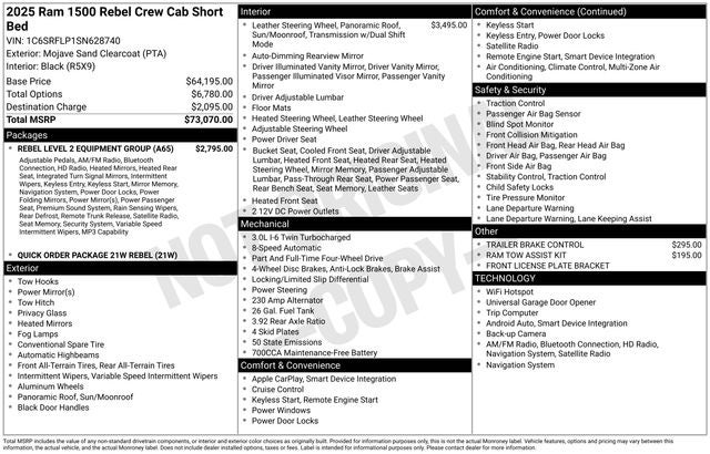 Quick Order Package 21W Rebel, Rebel Level 2 Equipment Group (115V Auxiliary Rear Power Outlet, 2-Door Passive Entry, Front Door Locks, 4G LTE Wi-Fi Hot Spot, Accent Color Door Handles, Accent Color Premium Power Mirrors, Accent Color Tailgate Handle, Apple CarPlay, Auto Power-Folding Mirrors, Auto-Dimming Exterior Driver Mirror, Black Painted Exterior Mirrors Caps, Connected Travel & Traffic Services, Connectivity - US/Canada, Convex Wide-Angle Exterior Mirror Insert, Driver Seat Memory, Dual Wireless Charging Pad, Exterior Mirrors Approach Lamps, Exterior Mirrors Courtesy Lamps, Exterior Mirrors w/Heating Element, Exterior Mirrors w/Memory, Exterior Mirrors w/Supplemental Signals, Front Passenger Interactive Display, Google Android Auto, GPS Antenna Input, GPS Navigation, harman/kardon 19 Speaker Premium Sound, HD Radio, Heated Second Row Seats, Integrated Voice Command w/Bluetooth®, Media Hub w/2 Charge Only USBs, Off-Road Information Pages, Power Adjust 8-Way Front Passenger Seat, Power Adjustable Pedals w/Memory, Power Tailgate, Proximity Approach/Departure Lamps, Radio: Uconnect 5 Nav w/14.4 Display, Radio/Driver Seat/Mirrors/Pedals Memory, Rain Sensitive Windshield Wipers, Rear Window Defroster, Security Alarm, SiriusXM w/360L, Smartphone As A Key Capable, and USB Host Flip), Rebel X (DISC) (4 Way Front Headrests, Bucket Seats, Dome Dual LED Reading Lamp, Dual-Pane Panoramic Sunroof, Floor Console, Front Seat Back Map Pockets, GT Interior Theme, Heated Front Seats, Heated Steering Wheel, Leather Wrapped Shift Knob, Leather-Wrapped Steering Wheel, Power 4-Way Driver Lumbar Adjust, Power 4-Way Passenger Lumbar Adjust, Power Adjust 8-Way Driver Seat, Premium Leather/Vinyl Bucket Seats (DISC), Rear 60/40 Folding Split Recline Seat, Rebel 10th Anniversary Side Graphics, Rough Road Cruise Control, Special Edition Console Badge, Steering Wheel Mounted Shift Control, and Ventilated Front Seats), 10 Speakers, 3.92 Rear Axle Ratio, 4-Wheel Disc Brakes, ABS brakes, Air Conditioning, Alloy wheels, AM/FM radio: SiriusXM with 360L, Apple CarPlay/Android Auto, Auto High-beam Headlights, Auto-dimming Rear-View mirror, Automatic temperature control, Brake assist, Cloth/Vinyl Bucket Seats, Compass, Delay-off headlights, Driver door bin, Driver vanity mirror, Dual front impact airbags, Dual front side impact airbags, Electronic Stability Control, Front anti-roll bar, Front Bucket Seats, Front Center Armrest w/Storage, Front dual zone A/C, Front fog lights, Front License Plate Bracket, Front reading lights, Front wheel independent suspension, Full Length Upgraded Floor Console, Fully automatic headlights, Garage door transmitter, Heated door mirrors, Heated front seats, Heated steering wheel, Illuminated entry, Leather steering wheel, Low tire pressure warning, Manual Folding Exterior Mirrors, Navigation System, Occupant sensing airbag, Outside temperature display, Overhead airbag, Overhead console, Panic alarm, ParkView Rear Back-Up Camera, Passenger door bin, Passenger vanity mirror, Power door mirrors, Power driver seat, Power steering, Power windows, Radio data system, Radio: Uconnect 5 Nav w/12.0 Display, RAM Tow Assist Kit, Rear 60/40 Folding Seat, Rear anti-roll bar, Rear seat center armrest, Rear step bumper, Remote keyless entry, Speed control, Split folding rear seat, Steering wheel mounted audio controls, Tachometer, Telescoping steering wheel, Tilt steering wheel, Traction control, Trailer Brake Control, Trip computer, Variably intermittent wipers, Voltmeter, and Wheels: 18 x 8.0 Painted Mid-Gloss Black.
