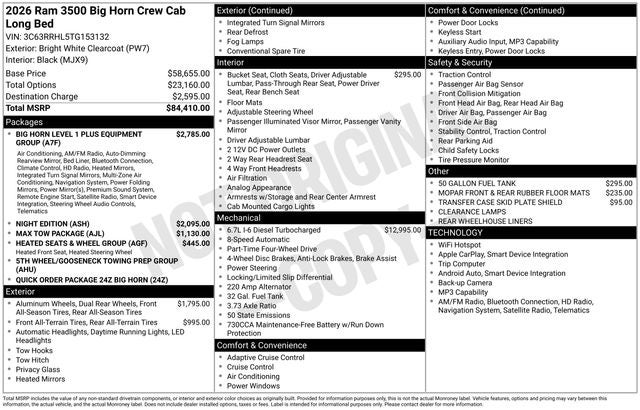 Big Horn Level 1 Plus Equipment Group (12 Touchscreen Display, 2 Way Rear Headrest Seat, 2nd Row in Floor Storage Bins, 4 Way Front Headrests, 40/20/40 Split Bench Seat, 4G LTE Wi-Fi Hot Spot, 9 Alpine Speakers with Subwoofer, Air Conditioning ATC with Dual Zone Control, Alexa Built-in, Apple CarPlay, Auto Power-Folding Mirrors, Auto-Dimming Rear-View Mirror, Black Exterior Mirrors, Cloth 40/20/40 Premium Bench Seat, Connected Travel and Traffic Services, Connectivity - US/Canada, Disassociated Touchscreen Display, Dual Glove Boxes, Emergency Vehicle Alert System (EVAS), Exterior Mirrors Courtesy Lamps, Exterior Mirrors with Heating Element, Exterior Mirrors with Supplemental Signals, Foam Bottle Insert (door Trim Panel), Folding Flat Load Floor Storage, Footwell Courtesy Lamp, For Details Visit DriveUconnect.com, For More Info, Call 800-643-2112, Forward and Reverse Utility Lights, Front Armrest with Cupholders, Front Center Seat Cushion Storage, Front Seat Back Map Pockets, Global Telematics Box Module, Glove Box Lamp, Google Android Auto, GPS Antenna Input, GPS Navigation, HD Radio, Integrated Voice Command with Bluetooth®, LED Bed Lighting, Locking Lower Glove Box, Luxury Steering Wheel, Manual Adjust 4-Way Front Passenger Seat, Mirror Running Lights, MOPAR Deployable Bed Step, MOPAR Spray in Bedliner, Off-Road Information Pages, Power 2-Way Driver Lumbar Adjust, Power Adjust 8-Way Driver Seat, Power Adjust Mirrors, Power Heated Fold Telescopic Mirrors, Power Telescoping Mirrors, Power-Adjustable Convex Aux Mirrors, Radio: Uconnect 5 Navigation with 12.0 Display, Rear 60/40 Folding Seat, Rear Dome with on/Off Switch Lamp, Remote Start System, Remote USB Port - Charge Only, Selectable Tire Fill Alert, SiriusXM Radio Service, SiriusXM with 360L, Steering Wheel Mounted Audio Controls, Storage Tray, and Trailer Tow Pages), Heated Seats and Wheel Group (Heated Front Seats and Heated Steering Wheel), Max Tow Package (5th Wheel/Gooseneck Towing Prep Group), Night Edition (Black Exterior Truck Badging, Black Interior Accents, Black Wheel Center Hub, Body Color Grille Surround, Gloss Black Nostrils/Molded in Color Black Grille, Painted Front Bumper, and Painted Rear Bumper), Quick Order Package 24Z Big Horn, Quick Order Package 2UZ Big Horn, 4-Wheel Disc Brakes, 50 Gallon Fuel Tank, 6 Speakers, 6000# Front Axle with Hub Extension, ABS brakes, Air Conditioning, Alloy wheels, AM/FM radio: SiriusXM, Apple CarPlay/Android Auto, Box and Rear Fender Clearance Lamps, Brake assist, Bumpers: chrome, Center Hub, Clearance Lamps, Cloth 40/20/40 Bench Seat, Compass, Delay-off headlights, Driver door bin, Dual front impact airbags, Dual front side impact airbags, Dual Rear Wheels, Electronic Stability Control, Front anti-roll bar, Front Center Armrest w/Storage, Front fog lights, Front reading lights, Fully automatic headlights, Heated door mirrors, Illuminated entry, Low tire pressure warning, Manual Adjust 4-Way Driver Seat, MOPAR Front and Rear Rubber Floor Mats, Nexen Brand Tires, Occupant sensing airbag, Outside temperature display, Overhead airbag, Overhead console, Panic alarm, ParkView Rear Back-Up Camera, Passenger door bin, Passenger vanity mirror, Power door mirrors, Power steering, Power windows, Radio data system, Radio: Uconnect 5 with 8.4 Display, Rear Folding Seat, Rear seat center armrest, Rear step bumper, Rear Wheelhouse Liners, Rear window defroster, Remote keyless entry, Speed control, Tachometer, Tilt steering wheel, Traction control, Trip computer, Turn signal indicator mirrors, Variably intermittent wipers, Voltmeter, Wheels: 17 x 6.0 Black Machined Aluminum DRW, Wheels: 17 x 6.0 Polished Aluminum, and Wheels: 18 x 8.0 Polished AluminuM.